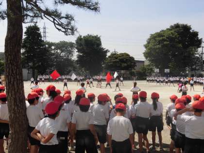22日火曜日、運動会全校練習を行いました、応援団が張り切って応援をリードしています。赤組が本校舎側、白組が正門側です。