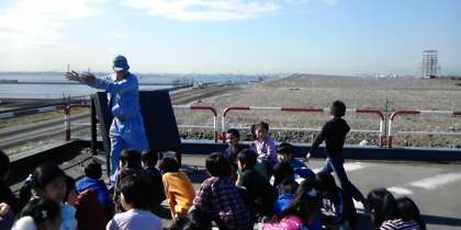 東京都中央防波堤に来ています。本当にごみの上に立っていることが信じられないくらいに広い土地です。羽田空港やスカイツリー、富士山も見えました。環境学習センターでは、クラスごとに別れて、係りの方にていねいにごみのことを教えていただきました。