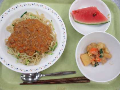 ジャージャーめん 牛乳 じゃがいものごま和え 小玉すいか