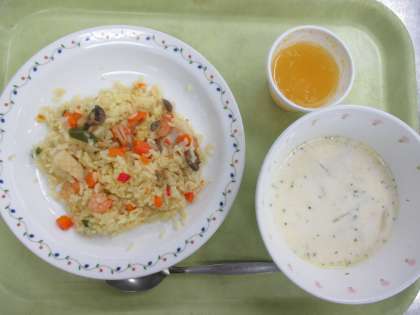 パエリア 牛乳 ポテトスープ フルーツゼリー