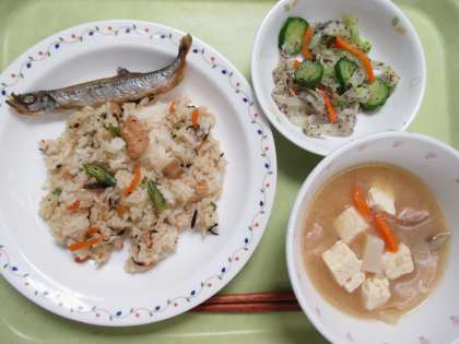 五目ごはん 牛乳 焼きししゃも 野菜のゆかりかけ 豚汁
