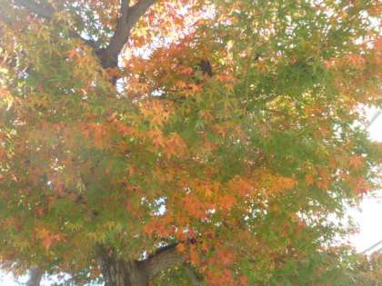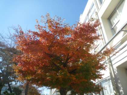 秋晴れの昼前、保健室前を歩いて、ふと空を見上げたら、目の前にきれいに紅葉したもみじがありました。昨日の雨でたくさんの桜の葉が落ち、まさに晩秋の気配が学校にまで届いています。