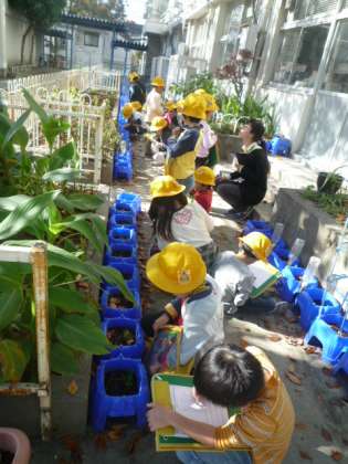 先日植えた球根の観察におりてきた1年生が、自分のプランタや1年生用の花壇を一生懸命観察していました。真剣にプランタの表面をのぞいて、「まだ球根の芽が出てこない。」と残念そうに話してくれました。「もうすぐ出てくるよ。よく観察しておくといいね。」と答えました。