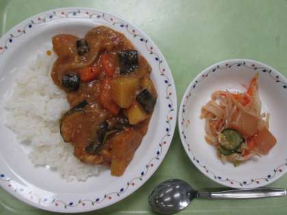夏野菜カレーライス 牛乳 こんにゃくサラダ