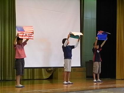 今日の児童集会では、放送委員会と給食委員会の委員会紹介がありました。放送委員会からは、放送機器の説明と注意事項の話とアナウンサーの基本となる「早口言葉」の披露がありました。難しい早口言葉をスラスラ発表する放送委員に大きな拍手が沸き起こりました。給食委員会からは、学校の1日の残菜の量や食材の輸入先などの給食に関係ある楽しいクイズをしながら給食について考えてもらうように企画していました。2つの委員会とも上手に発表できました。