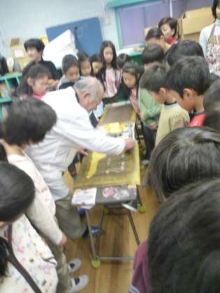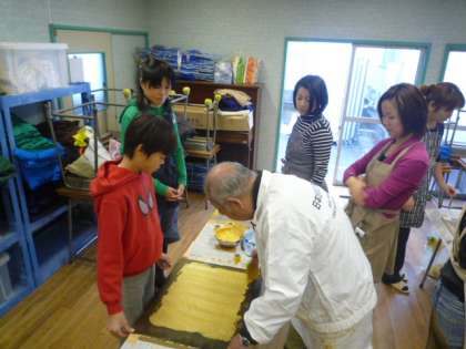4年生が、伝統工芸品の東京染小紋の型付けの体験を、協同組合の方々のご協力をいただいて、体験することができました。それぞれ一人ずつが、ランチョンマットサイズの布に、伝統的な小紋の型紙をのせて型付け作業を行いました。職人の方々のすばらしい手さばきとボランティアの保護者の皆さんの手助けで、どの子もとてもすてきなランチョンマットが出来上がりました。もうこの型紙を彫刻できる人が途絶えてしまって、貴重な体験になったと思います。ご協力いただいた皆様、ありがとうございました。