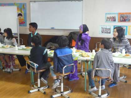2年1組に、マレーシアの高校生2人が訪問してきました。ヒポファミリークラブという国際交流を進めている方の紹介で、実現しました。2年1組の授業の様子や学校の施設見学をして、給食を一緒に食べました。給食では、宗教上の関係で食べられないものもあることを学びました。子どもたちがとても元気なことに驚いているようでした。