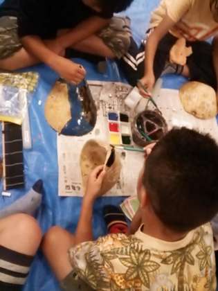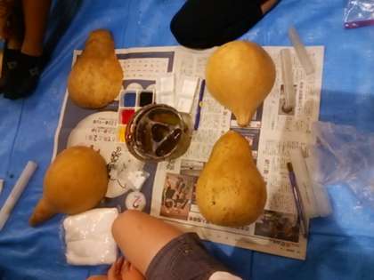 かんぴょうになるユウガオを使います。チョークでアウトラインを描きアクリル絵の具で色づけします。作り終えたふくべ細工は職人さんが工房に持ちかえり、仕上げをしてくださいます。