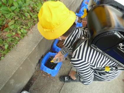 下校中の1年生が、自分のプランタに水やりをしていました。何を植えたの?と聞くと、「ムズカリとチューリップ」と教えてくれました。松の落ち葉がたくさんプランタに入っているのをきれいにして、丁寧に水やりをしていました。きっときれいな花が春になると咲くね。