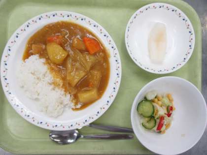 チキンカレーライス 牛乳 コーン入りフレンチサラダ 果物(梨)