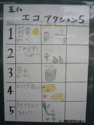 1年から6年までの各教室に、写真のような「玉小エコアクション5」というのがあるのを知ってますか?環境委員会の子どもたちが考えた5つのエコアクションです。いつもこの5つのことを考えながら行動できたら、玉小のエコは広がります。もう一度、みんなで見直すといいですね。