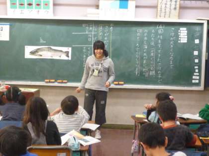 12/07 2年1組の「さけが大きくなるまで」の授業風景