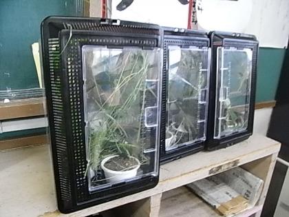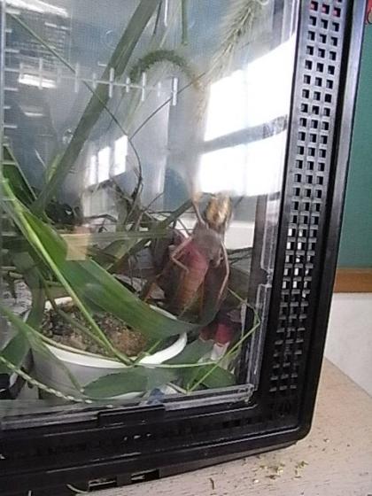 3年生が今週の火曜日に「多摩川のびのび学習」で多摩川の土手まで歩いて出かけました。そして、水辺の楽校の先生に教わって、昆虫をたくさん捕まえてきました。教室では、写真のように虫かごを立てて草を入れてバッタを飼っていました。水辺の楽校の先生から教わって、焙った砂を入れておいたら卵を産みつけたそうです。