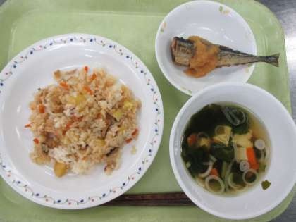 秋の香りごはん 牛乳 魚の塩焼き すまし汁