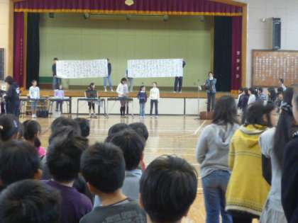 12/16 音楽朝会で「気球に乗ってどこまでも」を合唱