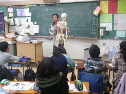 5時間目に、4年1組の教室に、がい骨が持ちこまれました。理科の授業の一環です。骨と筋肉の働きについて、考えてもらう時の教材です。「頭蓋骨がこんな形なのはなぜでしょう。」という問いかけに、「大切な脳を守るため」「脳みそじゃないよ。脳だよ」としっかりと答えていました。「あばら骨のところは何を守っているんだろう?」「心臓」「内臓」いろいろと答えていました。実物に近いもので子どもたちと学習を進めることは、意欲やたくさんの疑問を引き出してくれます。