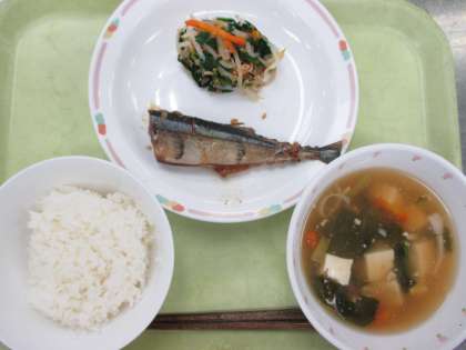 ごはん 牛乳 さんまの生姜煮 ほうれん草の乾物和え 豆腐汁