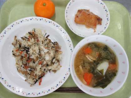 ひじきごはん 牛乳 鶏肉の南蛮焼き 味噌汁 みかん