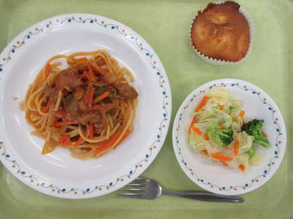 スパゲティナポリタン 牛乳 ブロッコリーのサラダ かぼちゃマフィン