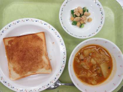 シナモントースト 牛乳 ボルシチ ビーンズサラダ