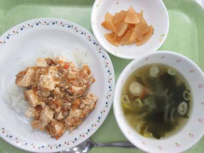 麻婆豆腐丼 牛乳 わかめスープ 大根の中華味