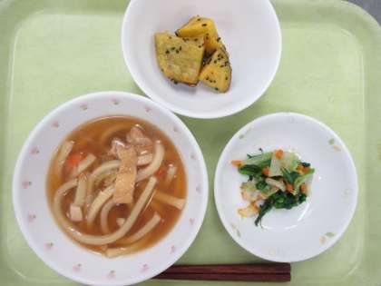 きつねうどん 牛乳 野菜のおかかかけ 大学芋