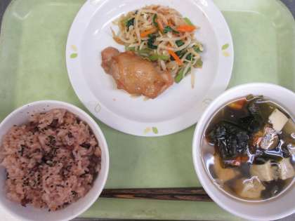赤飯 牛乳 鶏の照り焼き 野菜の辛子醤油あえ すまし汁