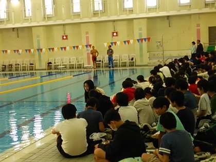 はじめに玉川中学校の温水プールで中町小6年生と一緒にパラリンピック金メダリストの泳ぎを見せていただきました。