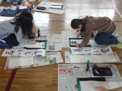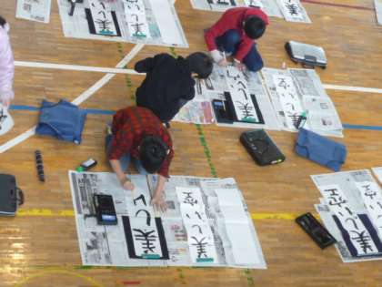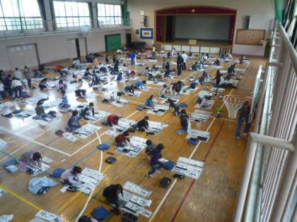3・4校時は、4年生が体育館を使って書初め大会を行っていました。ふだん床に座って書く体験がほとんどない中で、子どもたちは一生懸命取り組んでいました。
