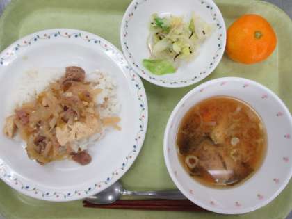 豚丼 牛乳 野菜の塩こんぶかけ 味噌汁 みかん