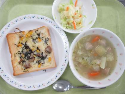 ねぎピザトースト 牛乳 ポトフ きゃべつサラダ