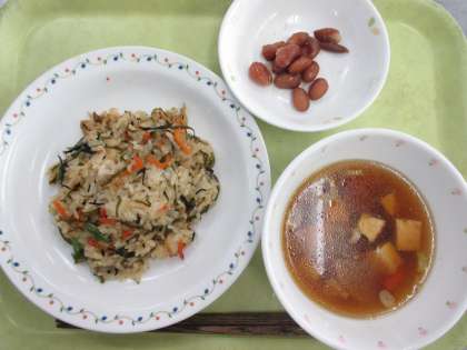 磯おこわ 牛乳 煮豆 鶏ごぼう汁