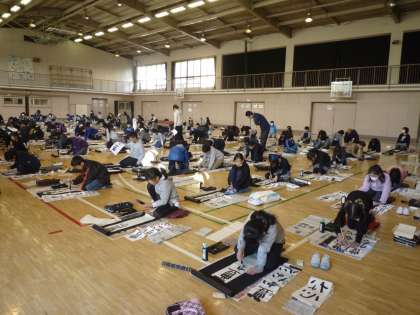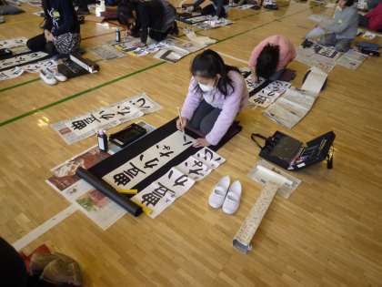 3学期が始まりました。始業式を終え、書き初めを体育館で行いました。いつもと違う細長い紙に、机でなく床で書く、といういつもと違う書写でしたが、真剣に丁寧に取り組みました。来週の書初め展が楽しみです。