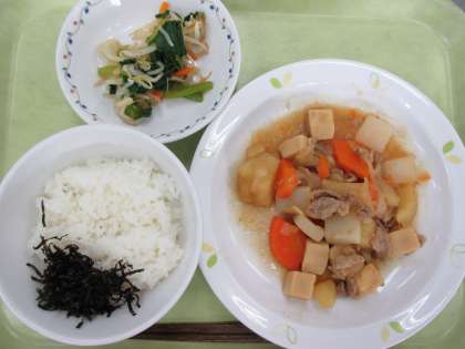 ごはん 牛乳 のりのふりかけ 肉じゃがのうま煮 野菜の辛子醤油かけ