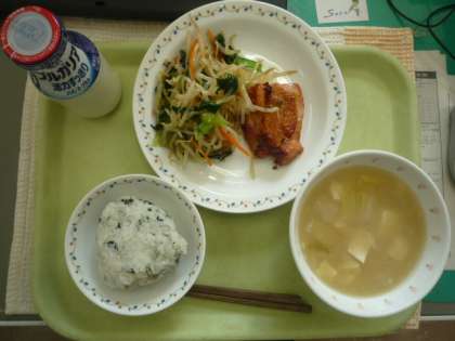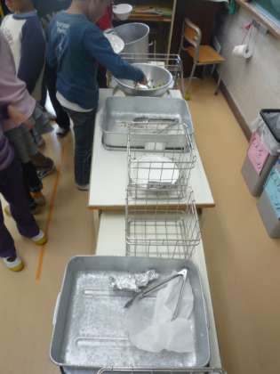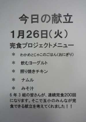 今日は、校内で連続完食200回の記録を達成し、さらに更新している6年3組のみんなが、玉小の全学級が完食できるような献立を考えてくれました。名付けて「完食プロジェクトメニュー」、たくさんの学級が完食したようです。6年3組のみんなありがとう!(写真は、1年2組の食管の様子です。)