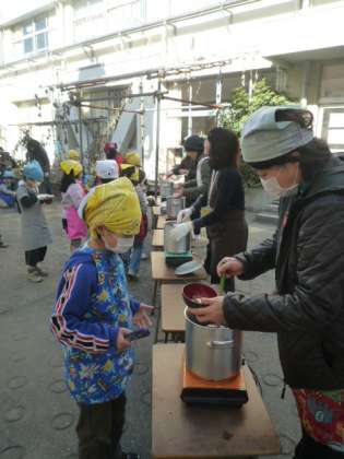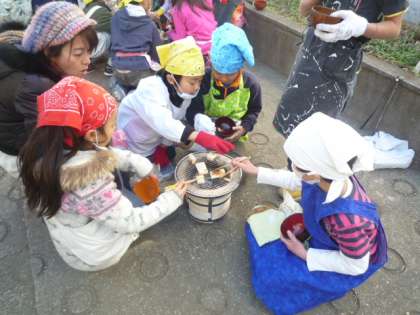 「昔の道具」について学習している3年生は、体験学習として「七輪」体験をしました。ほとんどの子どもたちの家には存在しなくなった七輪に炭を入れて火おこし、もちを焼いて、昔の道具のよさや大変さを感じ取っていました。そのあと、焼いたもちを、お手伝いのお母さんたちが作ったお汁粉に入れ、ぜんざいをおいしく頂きました。お手伝いしてくださった大勢のお母様方、寒い中ありがとうございました。