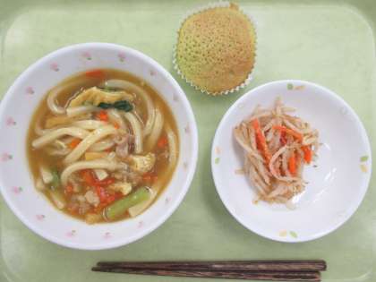 カレーうどん 牛乳 野菜のごまあえ 小松菜のケーキ