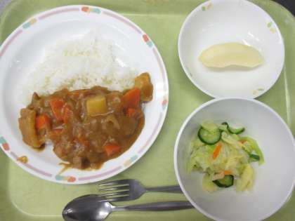 カレーライス 牛乳 野菜の甘酢あえ 果物(りんご)
