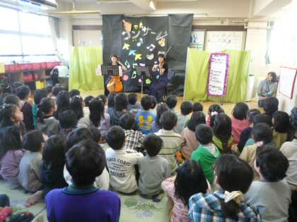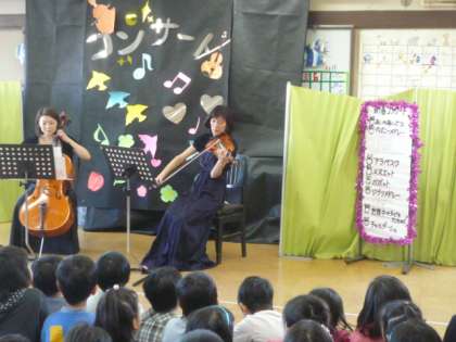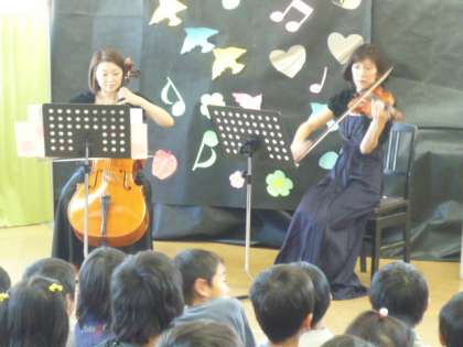 午後3時30分から、BOP室で、バイオリンとチェロのコンサートが開かれました。子どもたちが80人くらい集まって、ふだん耳にしたことのあるきれいなメロディを、生演奏で聴くことができました。演奏者は、本校の保護者の方でしたが、それはそれは素晴らしい演奏でした。