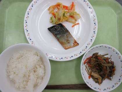 ごはん 牛乳 魚の七味焼き 白菜のおかかかけ 刻み昆布の五目煮