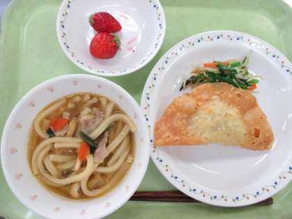 煮込みうどん 牛乳 ツナとポテトのパリっと揚げ 塩ナムル いちご