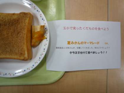 今日の給食では、学校の力山やBOPの建物の横に実っていた夏ミカンを、環境委員会の子どもたちや主事さんが収穫した夏ミカンが出ました。ちょっと全体にはいきわたらない数だったので、それを給食調理さんたちがマーマレードに調理してくださり、食パンのみみのところに乗せて給食に出てきました。夏ミカンのちょっとほろ酸っぱい皮のマーマレード、おいしかったです。