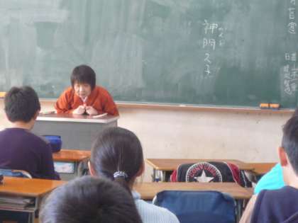 毎年恒例になっている、講談のアマチュアチャンピョンの神門久子(かんど ひさこ)さんによる子どもたちへの講談会。ちょうど「美しい日本語週間」にあたっていますので、とてもいい機会になりました。ふだんあまり聞いたことのない話し方に子どもたちは興味津々でした。明日まで行います。