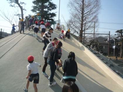 1週間使えなかった力山の滑り台でしたが、今朝、工事が終わった報告を受けて、今日から使えるようになりました。「つるつるになってる。」とうれしそうな子どもたちの声が聞こえました。来週には、今度は、くさりの受け部分の工事がまた入りますが、それまでの間、力山で楽しんでください。