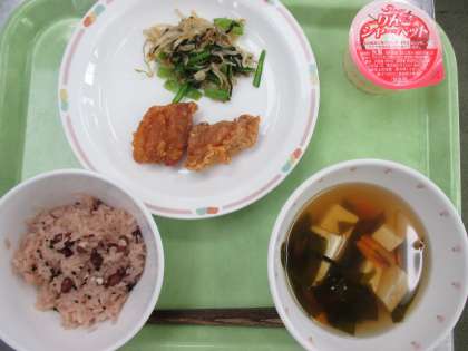 赤飯 牛乳 鶏の唐揚げ 小松菜の乾物あえ すまし汁
