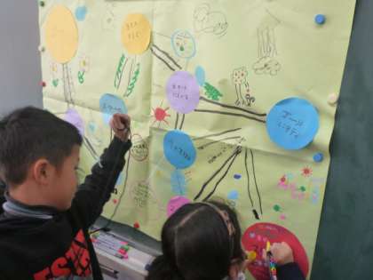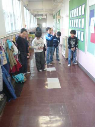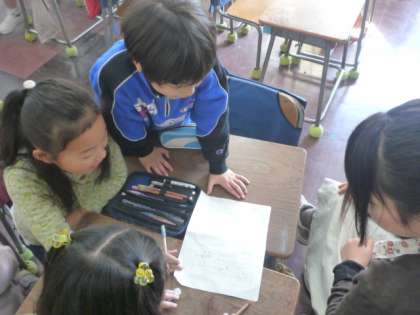 2年1組では、1年生との交流遊びを14日(月)に控えて、その準備に大わらわです。一生懸命司会台本の練習をする子、1年生にやってもらうすごろく作りに余念のない子、廊下でこま回しの練習をする子たち。みんな14日に、1年生とは違うかっこ良いところを見せようと、いろいろ工夫しながら取り組んでいました。