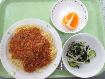 スパゲティーミートソース じゃこサラダ 清美オレンジ 牛乳