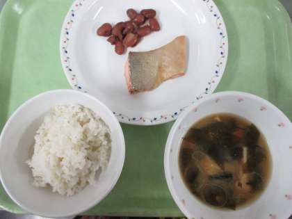 むぎごはん さけの照り焼き うずらまめのにまめ みそしる 牛乳