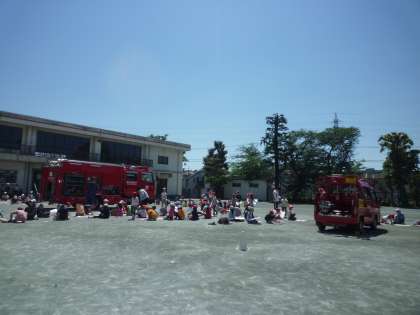 消防車が2台、玉川小の校庭に来てくれました。青空のもと、大きな画用紙いっぱいに描きました。よく見て、丁寧に仕上げていました。