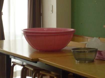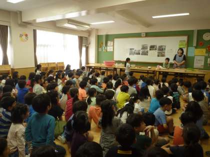 栄養士の先生による給食の授業を行いました。ざるの大きさを比べたり、給食クイズを出してもらったりしました。給食のひみつがわかったかな。